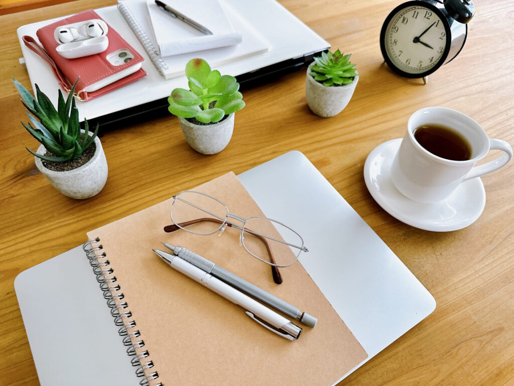 決まった机にノートを置いておくと習慣化しやすい。出勤前や在宅ワーク前の切り替えにも。
